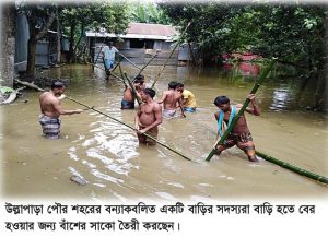 উল্লাপাড়া (সিরাজগঞ্জ) প্রতিনিধিঃ যমুনা ও করতোয়া নদীতে ব্যাপক পানি বৃদ্ধি এবং উজান থেকে নেমে আসা ঢলের পানিতে উল্লাপাড়ার বন্যা পরিস্থিতির আরো অবনতি হয়েছে। ইতোমধ্যেই উপজেলার ১৪টি ইউনিয়ন ও পৌরসভার ২ শতাধিক গ্রাম বন্যাকবলিত হয়ে পড়েছে। গতকাল পানিতে ডুবে মারা গেছে উপজেলার কালিগঞ্জ ও পাটধারী গ্রামের দুটি শিশু। ডুবে গেছে পাকা ও কাঁচা অনেক রাস্তা। পশ্চিমাঞ্চলের লাহিড়ী মোহনপুর, উধুনিয়া, বড় পাঙ্গাসী, বাঙ্গালা ও দুর্গানগর ইউনিয়নের মানুষের চলাচলে সৃষ্টি হয়েছে চরম দুভোর্গ। এদের যাতায়াতের এখন একমাত্র বাহন নৌকা। তলিয়ে গেছে এসব এলাকার ৩ হাজার ৩’শ হেক্টর জমির ফসল। উলাপাড়ার সংসদ সদস্য তানভীর ইমাম, উপজেলা প্রশাসনের কর্মকর্তা ও দলীয় নেতাকর্মীদের নিয়ে শুক্রবার উপজেলার মোহনপুর, বড় পাঙ্গাসী ও উধুনিয়ার বন্যাকবলিত এলাকা পরিদর্শন ও অসহায় লোকজনের মাঝে ত্রাণ সামগ্রী বিতরণ করেন।